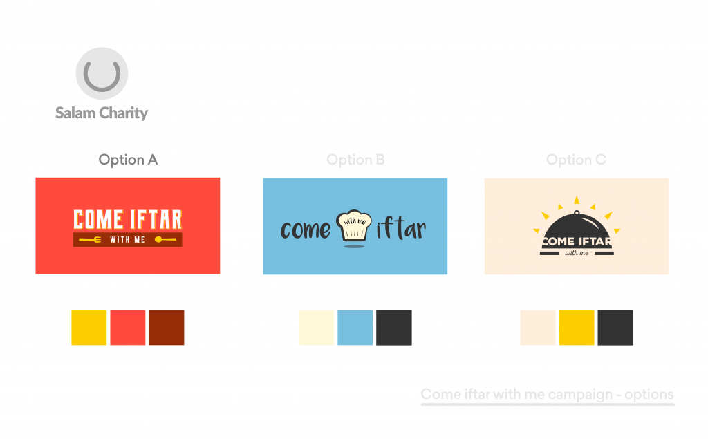 Initial concepts for another visual Identity for a seasonal fundraising campaign during Ramadan known as ‘Come Iftar with me’.